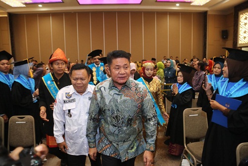 Gubernur Herman Deru saat menghadiri acara Wisuda Universitas Sumatera Selatan (USS) di Golden Sriwijaya, Kamis (2/10/2025).(foto-robby/jn)